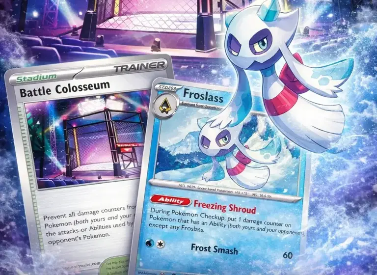 Battle Colosseum protege a los Pokémon en Banca de Freezing Shroud aunque la habilidad se dispare sola. El texto de la carta es