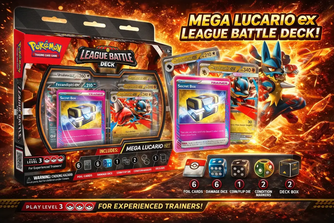 El League Battle Deck de Mega Lucario ex fue anunciado el 5 de marzo de 2026 con fecha de lanzamiento para el 22 de mayo de 2026 a un precio de $29.99 USD. Es un mazo de 60 cartas listo para jugar, diseñado para el nivel de juego competitivo — no para principiantes. Lo que hace a este producto distinto de la mayoría de los League Battle Decks anteriores es la carta que viene incluida: Secret Box, el ACE SPEC actualmente cotizado en alrededor de $14 USD en el mercado secundario. En un producto de $29.99 completo, eso es una proporción de valor que la comunidad ya identificó como excepcional.